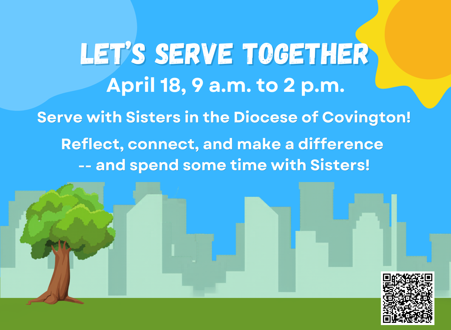 Community Service Day! April 18th, 9 am-2 pm We'll meet at the Mother of God Church Hall for prayer at 9 a.m., go out to serve at various agencies, and then come back together for lunch and some shared reflection on the experience. We’ll have opportunities to garden, work in a food pantry, help with bingo, and serve in other ways. All are welcome, and participants under 18 must be accompanied by a parent or guardian. Sponsored by the Benedictine Sisters of St. Walburg, the Sisters of Divine Providence, and the Sisters of Notre Dame. RSVP with the QR code above or here: tinyurl.com/ServeWithSistersCovington